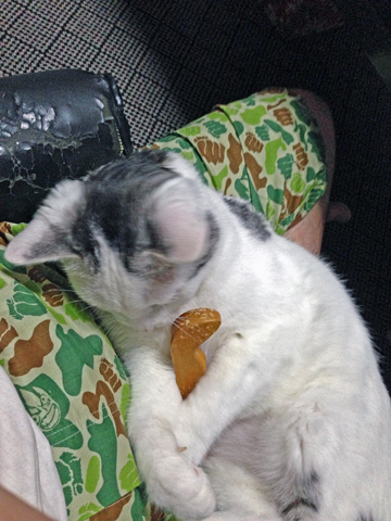 「コラッ!」と怒ってやると、うどん(細うどん)を一本すすった状態で